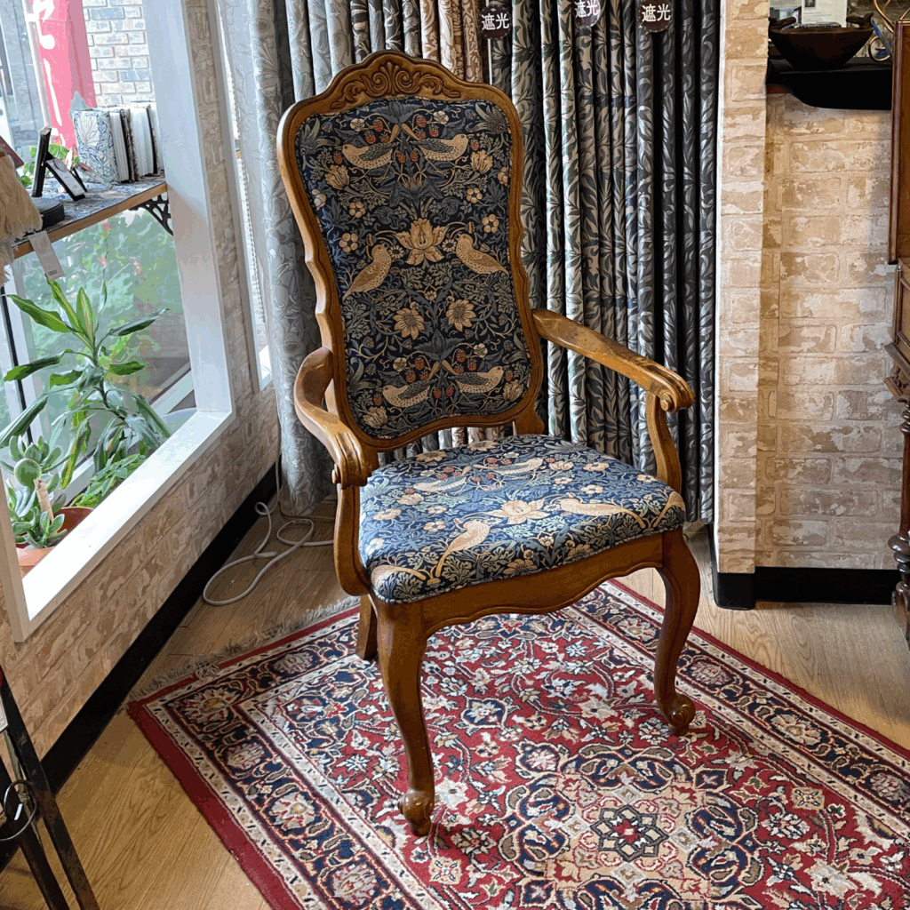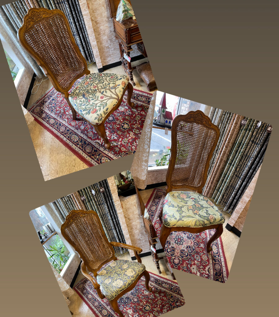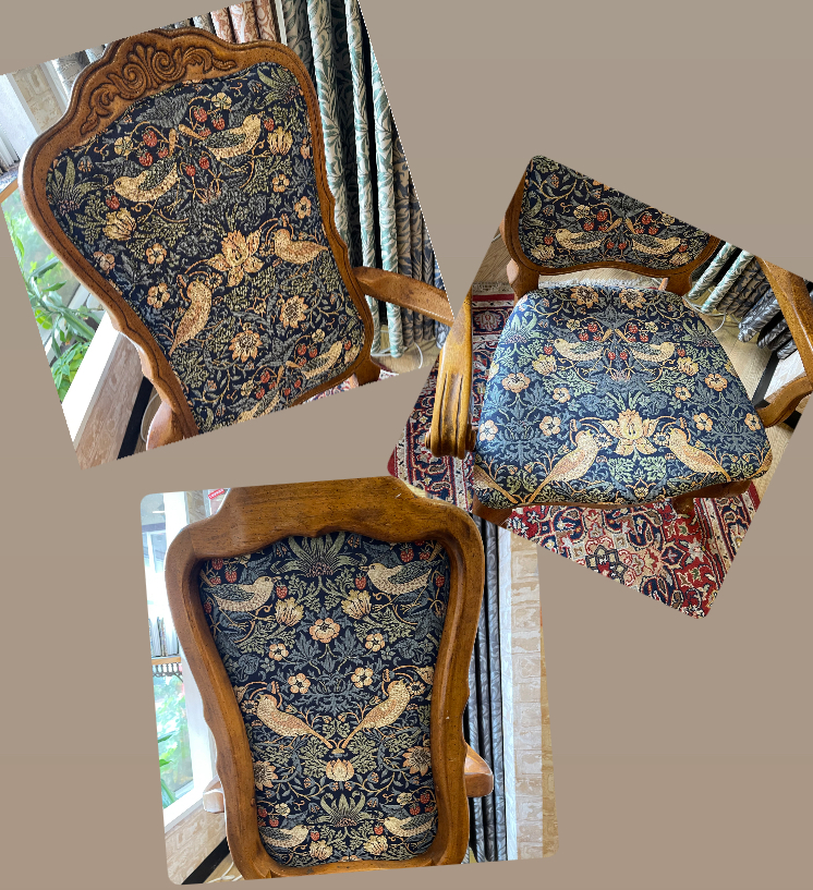 一脚は背面の傷みも見られたため、座面とあわせて「いちご泥棒」で張り替えました✨